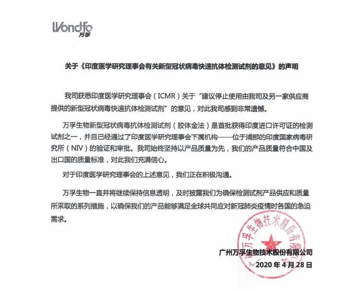 “我司获悉印度医学研究理事会(ICMR)关于‘建议停止使用由我司及另一家供应商提供的新型冠状病毒快速抗体检测试剂’的意见,对此我司表示非常遗憾。”在28日发布的声明中,万孚生物方面表示。
