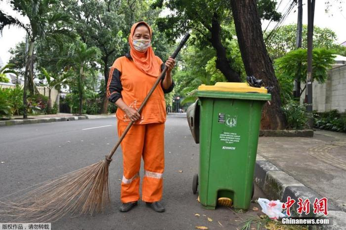 全球疫情之下,各行各业中还有很多人为了保障人民的日常生活,在自己的工作岗位上坚持着。图为印尼街头的清洁工。