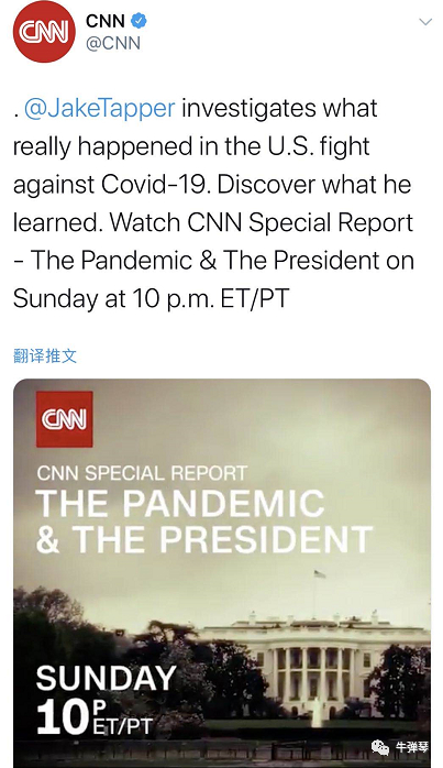 我赶紧上CNN看了看,难怪特朗普很生气,CNN将推出重磅调查节目《大流行病和总统》。30秒钟的预告片,第一个画面就是特朗普宣布:一切都在我们掌控中,我们美国的问题很轻微。