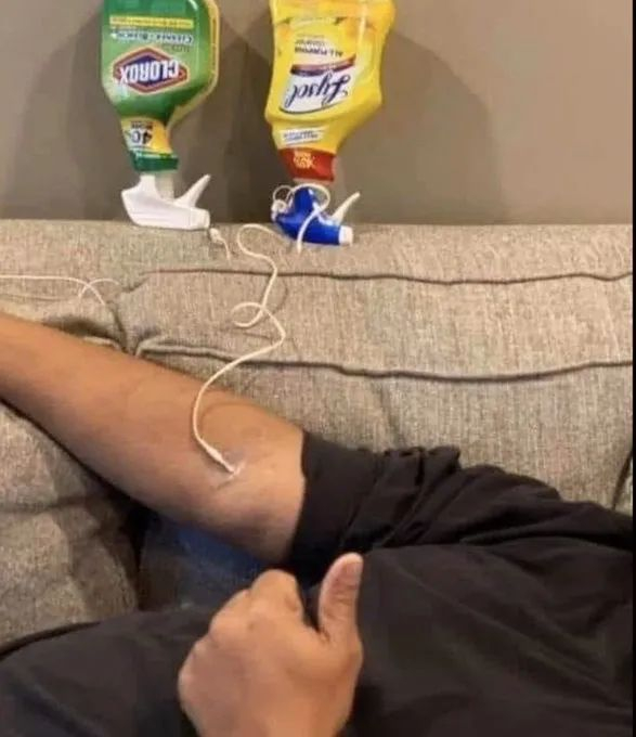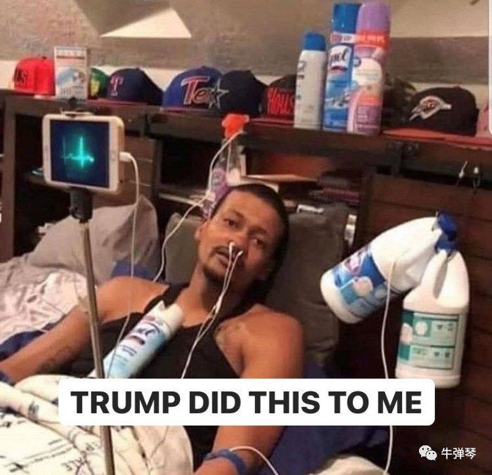 特朗普一声号召,淳朴的美国人马上行动起来,哪怕消毒剂厂家都紧急提醒,这只能外用,不能内服!但这真挡不住美国人的热情,一根皮管连到消毒液里,一个针头插到自己胳膊里。