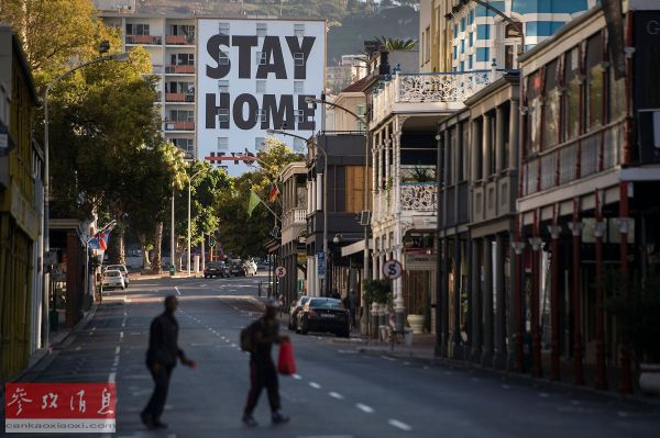 资料图片:南非开普敦街头出现“待在家里”的告示牌。(法新社)