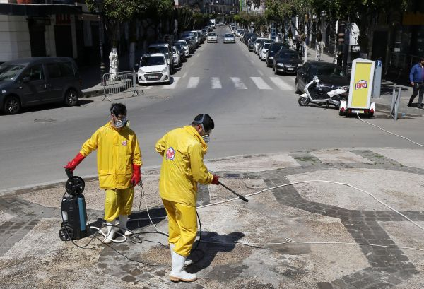 3月30日,工作人员在阿尔及利亚阿尔及尔市中心进行消毒。新华社发