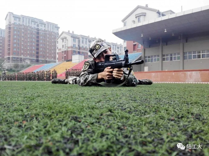 刘一鸣在操场练习射击动作