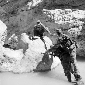 爬雪山,蹚冰河,一次巡逻便是一次生死考验。图为后来牺牲在河尾滩的战士巴依尔弓着腰,让战友踩着他的背攀上岩石。