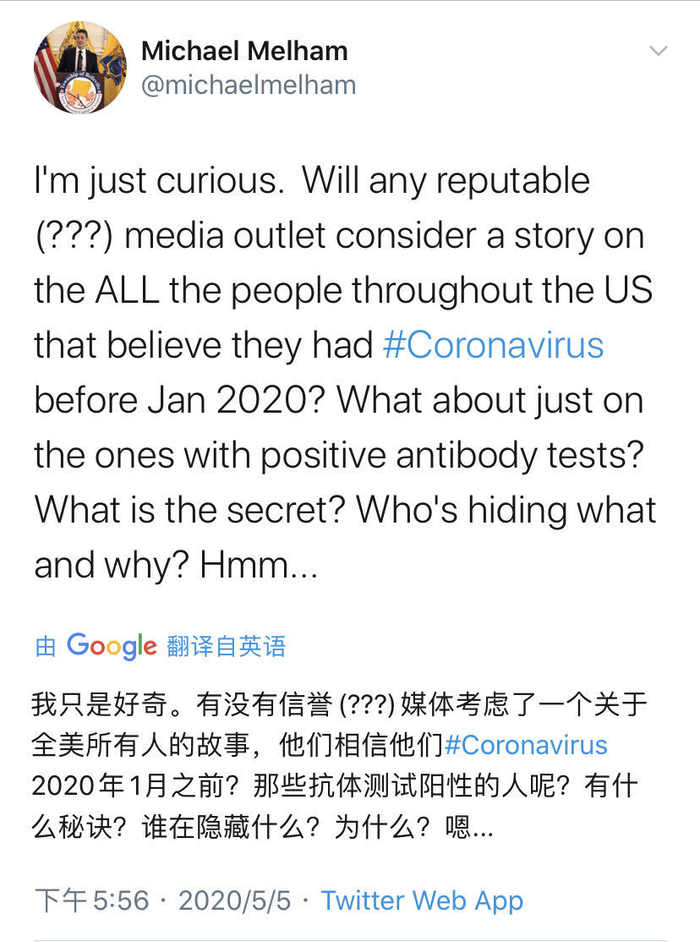 美国新泽西州埃塞克斯县贝尔维尔市市长 迈克尔·梅尔哈姆:“这确实不令我惊讶,因为我自己知道。我的医生说‘不要去改变你的生活,你依然需要戴口罩,依然需要保持社交距离’。但在这一部分我想特别说清楚,我的新冠抗体检测确实是阳性,我相信我是十一月感染的,当时我病得非常非常重,成年以后就没这么病过,基本上所有的症状也都吻合。