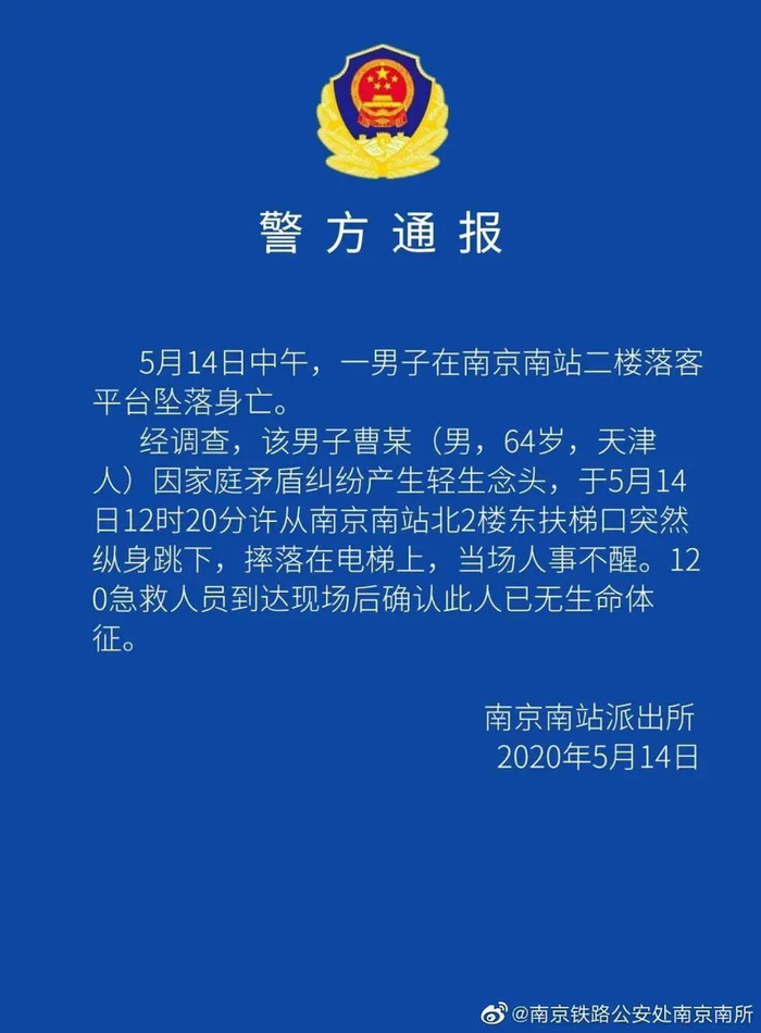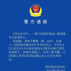 5月14日晚8点多,南京铁路警方发布通报称,5月14日中午,一男子在南京南站二楼落客平台坠落身亡。