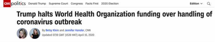 美国有线电视新闻网(CNN)对此评论,特朗普早已“蓄谋”数日,美国政府停缴会费的举措是其针对国际多边组织采取的一系列行动中的最新一个。实际上,截至今年3月31日,美国拖欠2019年世卫组织的会费有一半以上,2020年会费尚未支付。