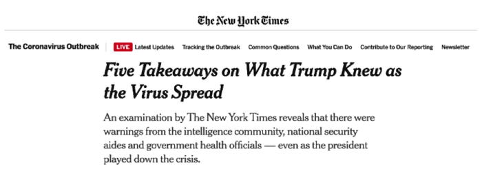 面对疫情,特朗普政府犹豫不决,错失良机,尽管美国情报界、国家安全委员会和政府卫生官员都曾多次发出警告,特朗普全部当作耳旁风。9日,连美国前总统奥巴马都批评现任总统特朗普的疫情应对是“混乱的灾难”。