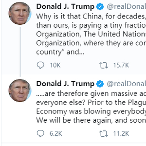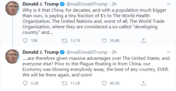 “为啥中国这么一个人口比我们多那么多的国家,在过去数十年里却只缴纳了世界卫生组织、联合国以及世界贸易组织一丁点的费用,还被视为发展中国家,进而获得了比美国要多得多的优势……在来自中国的瘟疫袭来之前,我们的经济比所有人都要好,是最好最好的国家,我们很快会重新振作!”