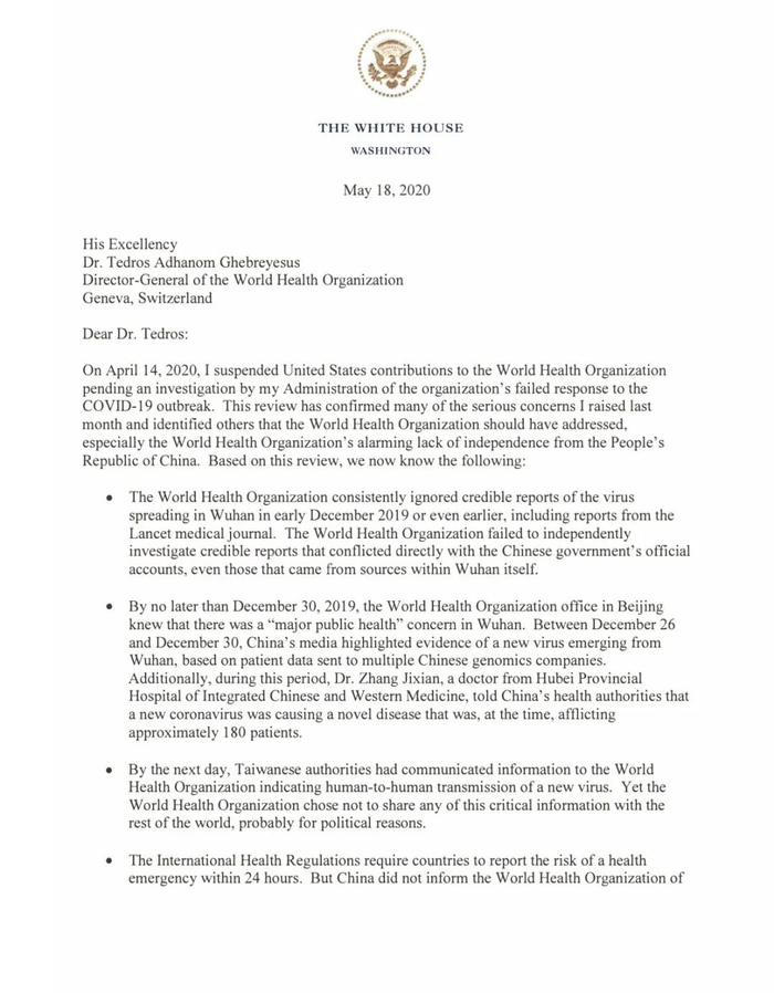 特朗普在信中表示,如果世卫组织“不能承诺在未来30天内作出重大实质性改善,我将永久冻结美国向世卫提供的资金,并重新考虑美国在该组织的成员身份”。