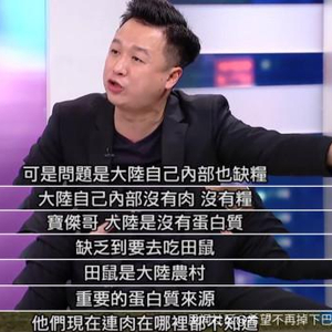 台湾时事评论员李正皓在分析此事时超级激动,狂喷大陆“没有肉没有粮”还胆敢征收澳洲牛肉和大麦的税,“大陆没有蛋白质,缺乏到要去吃田鼠!田鼠是大陆农村最重要的蛋白质来源!”