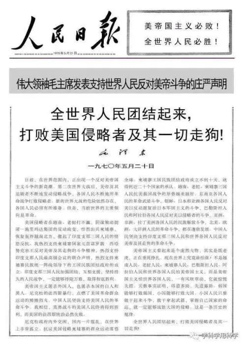 1970年5月,针对美国悍然入侵柬埔寨等霸权行径,伟大领袖毛主席发表震撼世界的“520”声明。