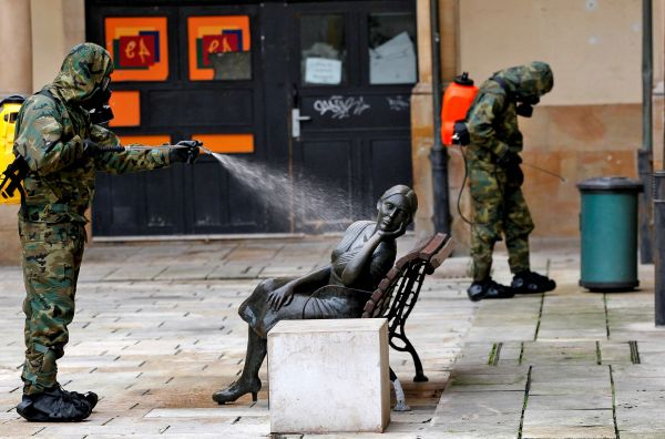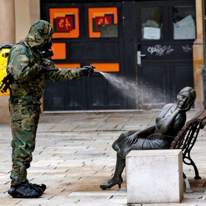 当地时间4月2日,在西班牙北部的奥维耶多,士兵对一处雕像喷洒消毒剂。(欧洲新闻图片社)
