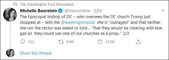 《华盛顿邮报》记者表示,圣约翰教堂的监管者、华盛顿圣公会主教告诉《华盛顿邮报》,她感到“愤怒”,她和教区牧师都没有被询问或被告知“他们将使用催泪弹清理抗议者,这样他们就可以利用我们的教堂作为道具。”