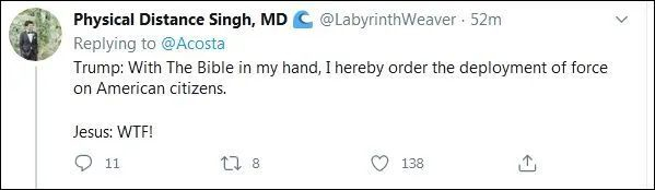 CNN白宫记者吉姆·阿科斯塔在推特写道:“警察和美国军方人员被派去驱散抗议人群,这样特朗普就可以在教堂外举起圣经了。”