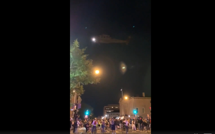 从民众上传的视频可以看出,在华盛顿特区一些“黑鹰”直升机以极低的高度悬停在抗议民众的上方,试图借助旋翼吹起的气流、垃圾和尘埃,驱散参加集会的民众。