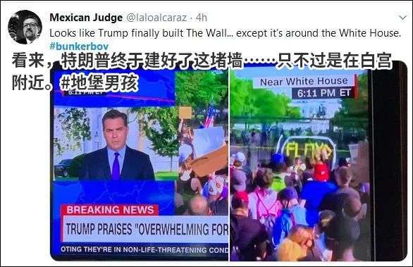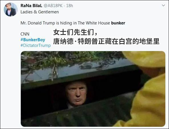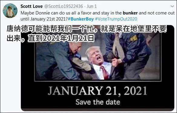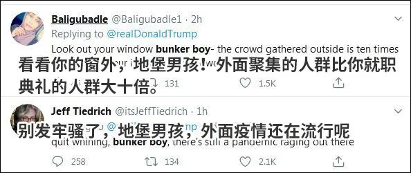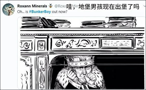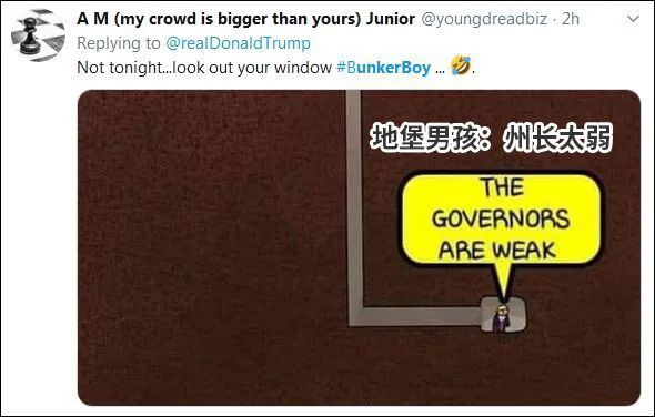 的确,自从5月31日,弗洛伊德之死引发的抗议蔓延至白宫,特朗普狼狈遁入白宫地下掩体后,他就多了一个绰号:地堡男孩。现在,不管是在推特搜索“Bunker boy”,还是在微博搜索“地堡男孩”,搜索结果的主角都是特朗普。就连他自己发的推特下面,很多网友也用这个新外号称呼他。