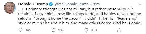 特朗普接着写道,“这人的主要能力压根不在军事上,公共关系倒搞得不错。我已经给了他新的生活,让他有事情可以做,给了他可以去赢得的战争,可他呢?极少能做成功。我不喜欢他的‘领导’风格,也不喜欢他其他的方面,并且很多人都认同我。真开心他离开了!”