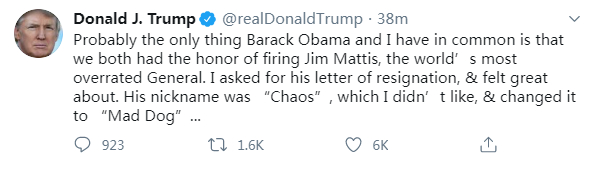特朗普在推文中说, “也许巴拉克·奥巴马与我唯一的共同点在于,我们都有幸解雇了吉姆·马蒂斯,(这个)世界上最被高估的将军。我向他要了辞职信,感觉棒极了。他的绰号是‘混乱(Chaos)’,我不喜欢,我把它改成了‘疯狗’。”