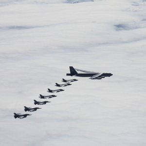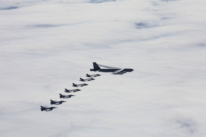 挪威空军的4架F-35战斗机、3架F-16战斗机与美军B-52轰炸机开展联合训练