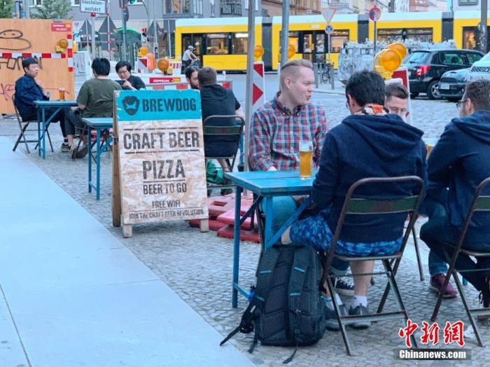 6月3日,柏林市中心一家精酿啤酒吧的顾客坐在街边饮酒。每桌顾客均保持了1.5米以上的距离。 中新社记者 彭大伟 摄