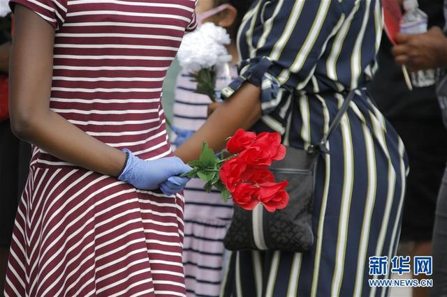6月8日,在美国得克萨斯州休斯敦市,人们手拿花束等待瞻仰弗洛伊德遗体。 新华社 图