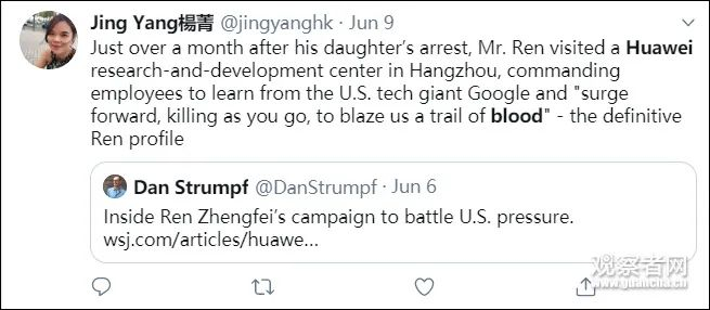 此文一出,立刻引发诸多对华偏执狂的共鸣。加之近期华为遭遇“芯片供应链遭打压”、“孟晚舟案进展不利”等事件,文章渲染任正非大有对美国反攻之势。而实际上《华尔街日报》正以“任正非撸起袖子准备和美国干架”为标题,甚至还在暗示任正非要“给女儿报仇”。
