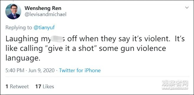 也有人以牙还牙,直译英文俗语进行反击:就好比说《华尔街日报》的翻译“烂死了”,但实际是和“死”没有关系。也有人反指英语俗语按照美媒的直译标准,更加暴力。譬如美国俗语“试一下(take a shot)”,直译过来为“挨一枪”,“这难道不是枪械暴力吗?”