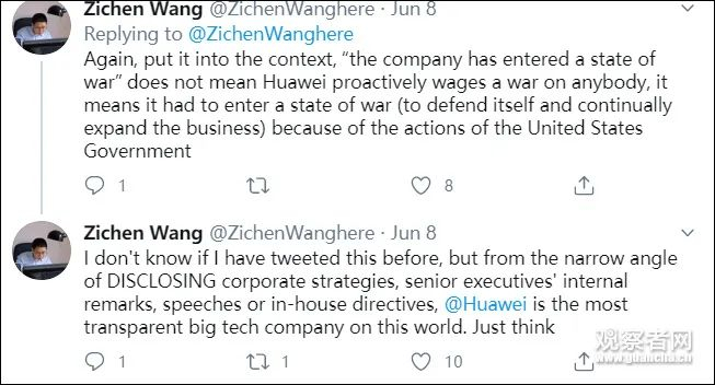 新华社记者王子辰在推特上回应,说一家公司进入战时状态,并不意味这家公司会对谁开战。正是因为美国政府的行为,华为才进入战时状态,它这么做是为了捍卫自己。“就从公开企业战略、公开高官内部谈话文件等角度来看,华为称得上是全球最透明的科技公司了。”