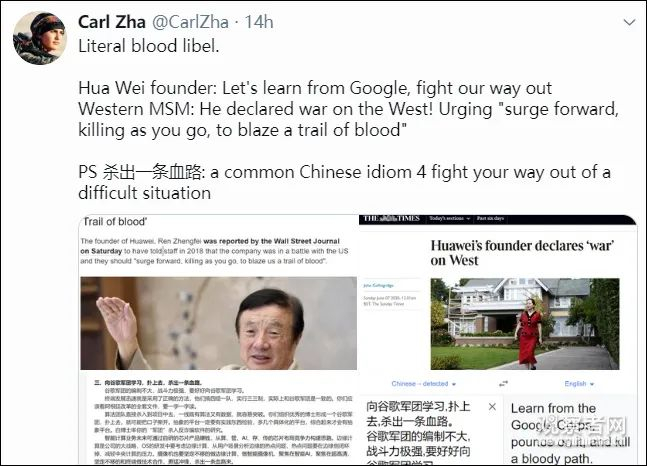 而这句“杀出一条血路”则被西方媒体误解为宣战口号。其实不仅是媒体,一些自称是“中国问题”专家的西方学者,近日也在社交媒体上转载文章,原封不动照抄《华尔街日报》的译文,叫嚣这是“暴力”。其中还不乏有亚裔记者转发了这篇文章。
