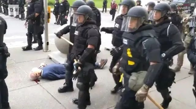 据媒体此前报道,当地时间4日,正是布法罗市宵禁生效前夕。现场目击者提供的一份视频显示,在布法罗市尼亚加拉广场,一名戴着口罩的老人左手拿着头盔、右手拿着手机,走到了列队前进的警察面前试图交谈。当老人接近全副武装的警察时,警察突然大喊:“把他推走!”随后,老人面前的警察一人伸出手、一人伸出警棍把他推倒在人行道上。老人倒下时仰面着地,发出了一声巨响,头部和耳部开始流血。画面显示,警察无视受伤的老人,继续列队前进并阻止阻拦在前的其他抗议者。