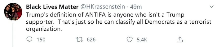 “特朗普对‘反法西斯主义运动(ANTIFA)’的定义,就是那些不是特朗普支持者的人。那只是为了让他把所有民主党人都归类为‘恐怖组织’。”