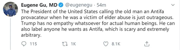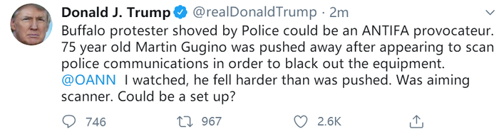 时隔5天,特朗普9日在推特上就此事发声,不过并不是对警方暴力对待老人进行谴责。他写道:“被警察推撞的布法罗抗议者可能是一个ANTIFA(反法西斯主义运动)煽动者。75岁的马丁·古吉诺似乎是在扫描警用通讯以切断设备后才被(警察)推开的。”