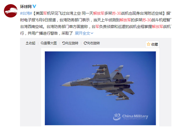 就在美军机飞越台湾的同一天,同样是上午,台防务部门侦察到多架次的解放军苏-30战机短暂进入台湾西南空域,也就是说,跟美军机当天进入的也大概是同一空域。