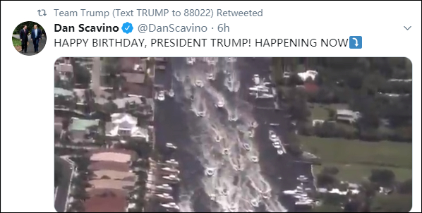 除了线下祝福,在佛罗里达州的最大城市迈克逊维尔市——支持者们在圣约翰斯公园内组织了盛大的船队航行,为特朗普庆生。