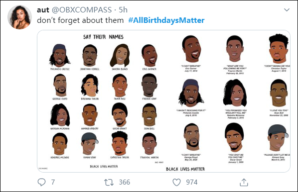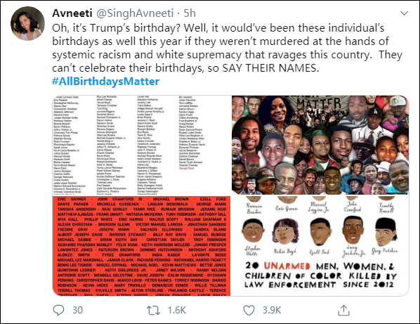 “今天是特朗普的生日?好吧,如果下面的这些人不是因这个国家泛滥的系统性种族歧视、白人至上主义而死的话,今年,他们也能过生日。他们今年不能过生日了,所以,说出他们的名字吧。#所有的生日都是生日”——