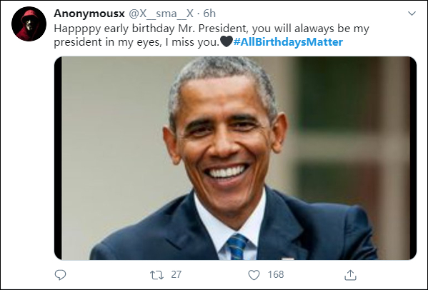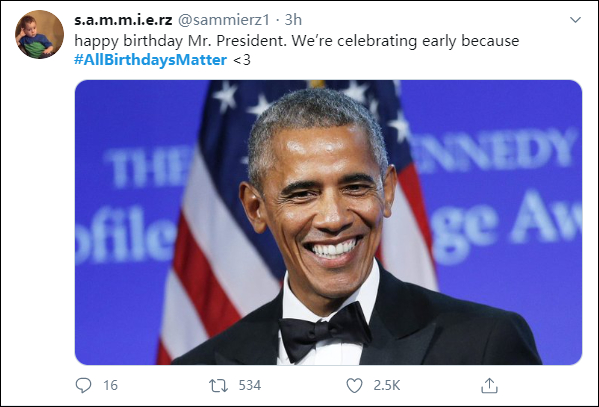 而网民们在特朗普生日这天,提前祝福奥巴马生日快乐已是一年一度的“常规操作”,今年更是用“黑人的命也是命”(Black Lives Matter)的句式,制造了“所有生日都是生日”(All Birthdays Matter)的热门话题。