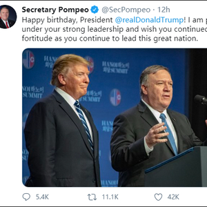 蓬佩奥在14日一大早8时15分,就发布推特称,“生日快乐@特朗普总统!能在你的坚强领导下担任公职,我十分骄傲。愿你依旧力量充沛,刚毅不屈,继续领导这个伟大的国家。”