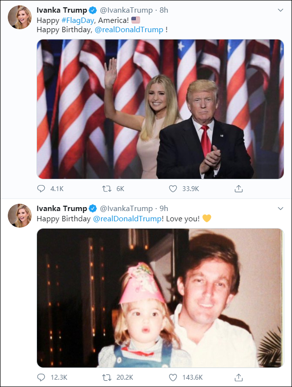 特朗普的大女儿伊万卡·特朗普于14日早10:45发布推特祝福父亲生日快乐,并配上小时候与父亲的合照。一小时后,她发布一张二人合照,再次祝福特朗普,同时祝美国国旗日快乐(6月14日也是美国国旗日)。