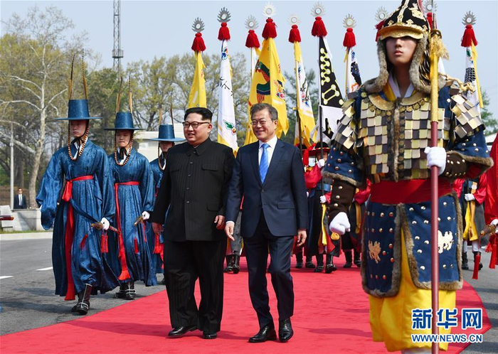 2018年4月27日,朝鲜最高领导人金正恩(中左)与韩国总统文在寅(中右)在板门店出席欢迎仪式 图自新华网观察者网:今年四月份的时候曾传出金正恩病危的报道,但后来证明并非如此。就您的了解,这种误报是不是另有隐情?