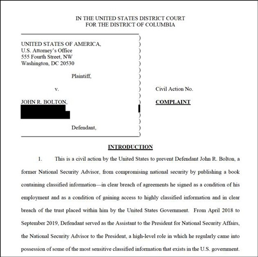 该诉讼称,“(博尔顿)经常掌握一些美国政府中最敏感的机密信息。在离开政府部门两个月内,被告博尔顿就去谈了一笔价值约200万美元的出书交易。他写了一份500多页的手稿,其中包含大量机密信息,还打算将手稿公之于众。”