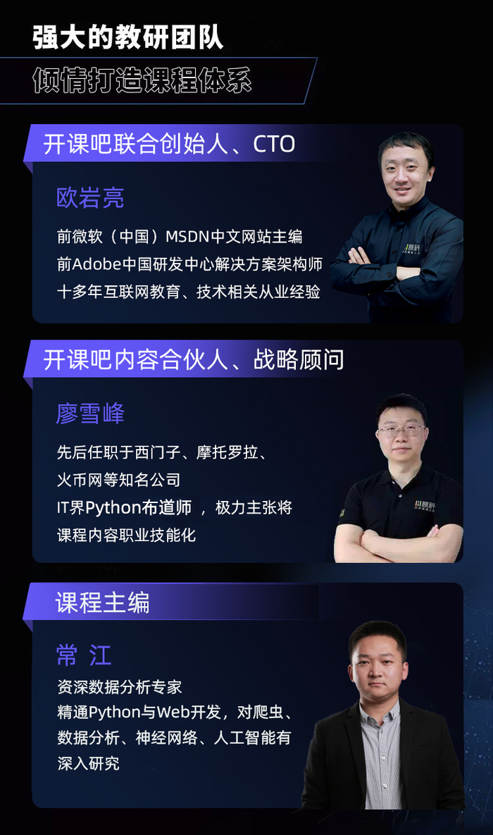 「开课吧」是慧科集团旗下泛互联网人职业提升平台,整合了全球知名IT、互联网企业一线师资及实战项目,聚焦每一位用户的学习与成长。