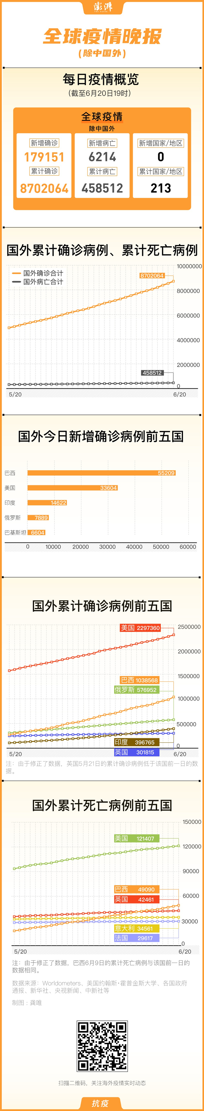 据澎湃新闻(www.thepaper.cn)不完全统计,截至北京时间6月20日19时,中国以外已有213个国家和地区出现新冠肺炎疫情,累计确诊病例超过870万例,累计死亡病例超过45.8万例。