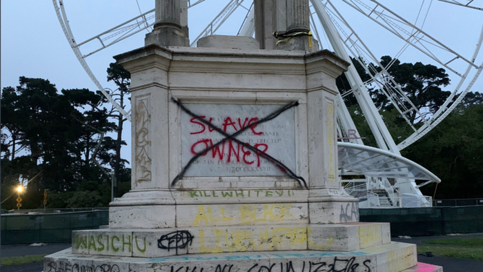 据美国广播公司(ABC)报道,当地时间周五(19日)晚8点左右,约400名示威者聚集在旧金山金门公园,园内的弗朗西斯·斯科特·基(Francis Scott Key)雕像被示威者套上绳子然后拉倒。基是美国国歌《星条旗》的词作者,但也是蓄奴者。