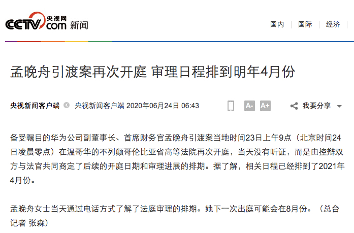 备受瞩目的华为公司副董事长、首席财务官孟晚舟引渡案当地时间23日上午9点(北京时间24日凌晨零点)在温哥华的不列颠哥伦比亚省高等法院再次开庭,当天没有听证,而是由控辩双方与法官共同商定了后续的开庭日期和审理进展的排期。据了解,相关日程已经排到了2021年4月份。