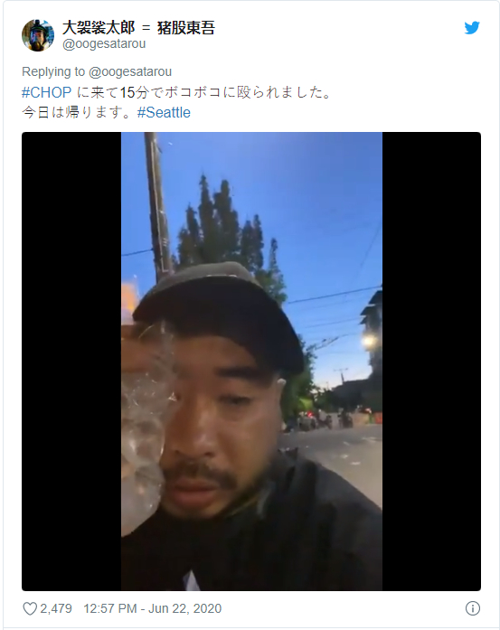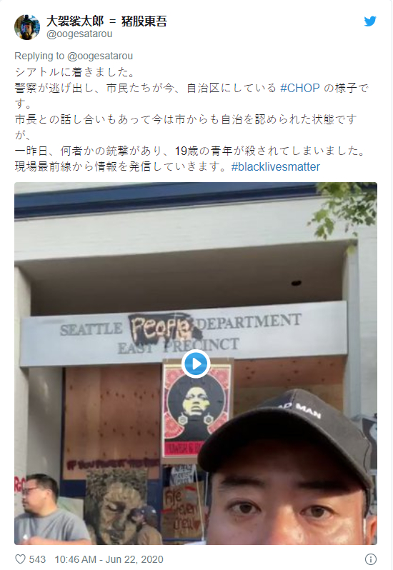 22日,“大袈裟太郎 = 猪股東吾”发推:“我到了西雅图。这(视频)是警察撤离后,市民们在‘国会山抗议占领区’(CHOP)的样子。经过和市长协商,现在‘国会山抗议占领区’已经得到了该市承认,但这里前天发生了枪击案,一名19岁的青年被枪杀。(我)在现场最前线进行报道。”