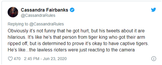 还有人说:“显然,他受伤一点也不好笑,但他的推特却很搞笑。他就像《养虎为患》(美国犯罪题材纪录片)里的那个人,手臂都被撕掉了,但他还决心要证明圈养老虎是可以的。他就像……无法无天的示威者只是在镜头前表现一下。”↓