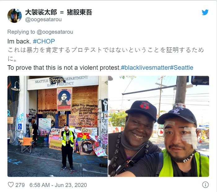 他的推文中,还用日、英双语强调,自己回来是为证明“这不是一场暴力的抗议”。但推文配图中,他脸上显然已受伤,贴着纱布和胶带。