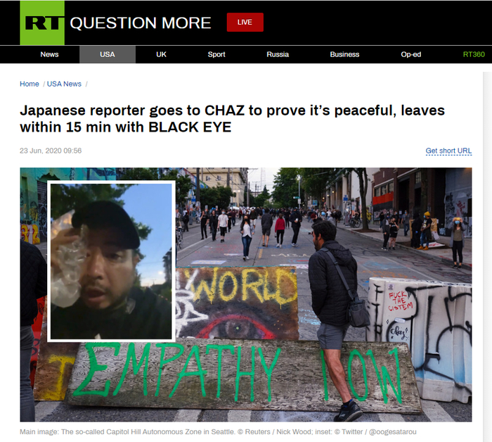 美国“黑人之死”引发的反种族歧视怒火延烧世界多地,“今日俄罗斯”(RT)23日讲述了这样一件事:一名日本记者前往抗议爆发地之一——美国西雅图市,就示威者成立的“国会山自治区”(CHAZ)相关动态进行报道,以为证明抗议是和平的。令人哭笑不得的是,仅15分钟,该记者就被打伤、捂着冰袋离开现场……