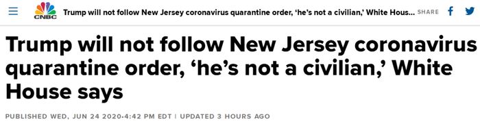 CNBC:白宫说,特朗普不会遵守新泽西州新冠病毒隔离令,“他不是平民”